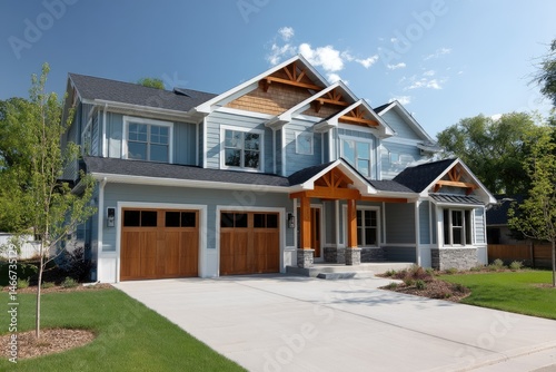 Dual garage home with cedar accents and light blue siding --ar 3:2 --v 7 Job ID: e6d89b3c-557d-4f72-a0d4-d6b8e99c44d1