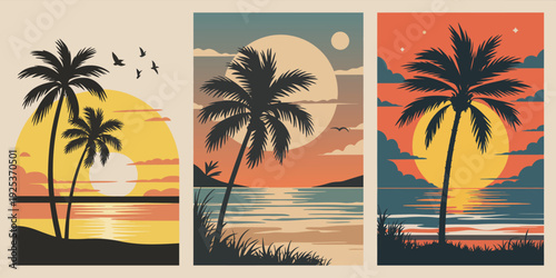 Dual Sunset Landscape Poster, Featuring Golden Orange Sky with Flying Birds and Teal Turquoise Sunset Scene