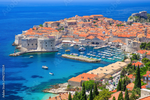 Dubrovnik, Croatia. A panoramic view of the walled town and Dubrovnik city port.