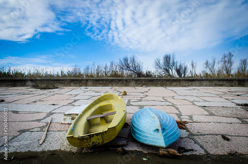 Due piccole barche, una gialla e una azzurra, tirate in secca sui murazzi del Lido di Venezia,