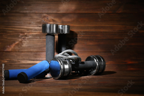 Dumbbells and skipping rope on wooden background