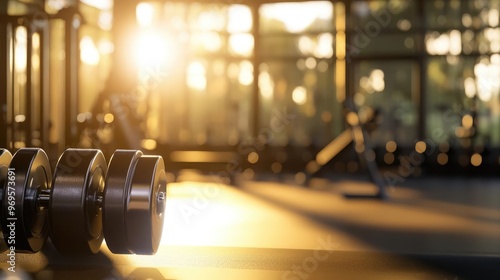 Dumbbells in a gym at sunset, highlighting fitness equipment and a vibrant training atmosphere for workout enthusiasts.