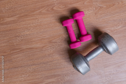 dumbbells with plastic coating on a wooden background