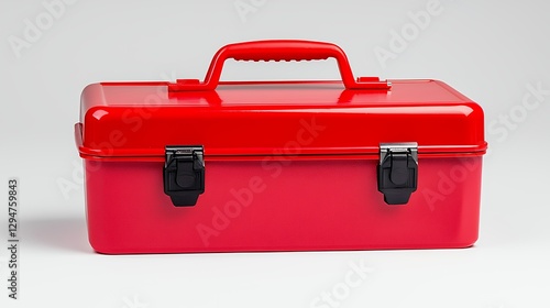 Durable Red Metal Toolbox with Black Clasps on White Background