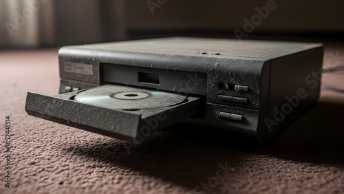 Dusty old CD player on a carpeted floor, a relic of outdated technology