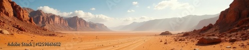 Dusty terrain stretches towards distant mountains, rocky, barren, rocks