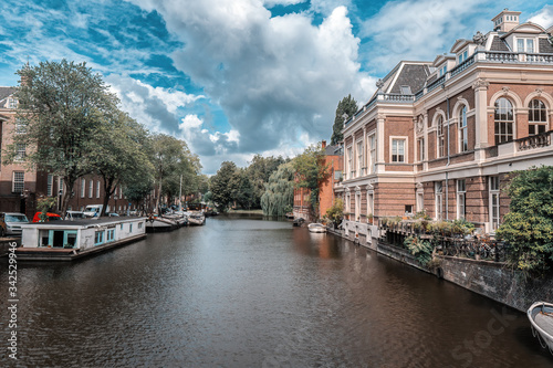 Dutch waterway in Amsterdam with a view of houses and houseboats