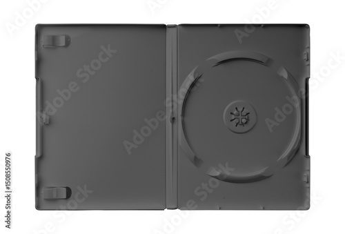 DVD disk video case on black background. Isolated game transparent mockup. Clean cover box template.