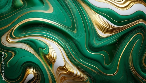 Dynamic 3D Fluid Marble: Green and Gold Abstract Design