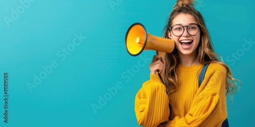 Dynamic announcement - smiling young woman with megaphone promoting sale offers on single colour background, ideal for banner design or with space for text, emphasizing enthusiasm and engagement