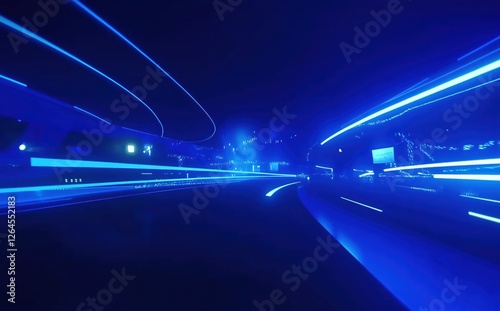 Dynamic Blue Light Trails Streaming Through a Vibrant Urban Landscape at Night