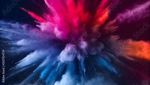 Dynamic burst of red and blue powder, captured in mid-air with vivid colors blending in a vibrant, energetic cloud