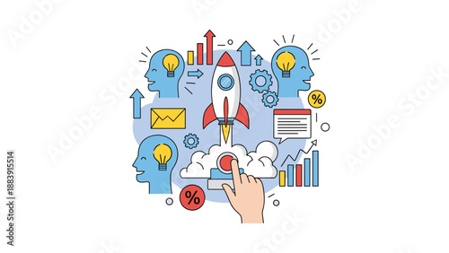 Dynamic business concept graphic features a rocket launch surrounded by symbols of ideas, teamwork, strategy, and creative thinking.