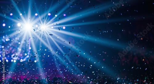 Dynamic celebration atmosphere with colorful confetti falling, illuminated by bright stage lights in a festive setting