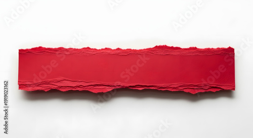 Dynamic crimson red torn paper strip with rough, textured edges, creating a striking contrast on a clean white background, ideal for bold graphic design, urgent messages, or conceptual impact