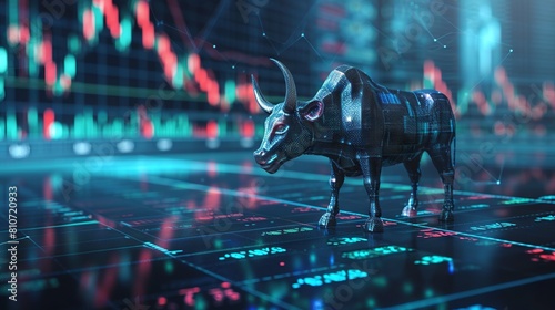 Dynamic financial district scene with graphs depicting bull market trends amidst corporate skyscrapers