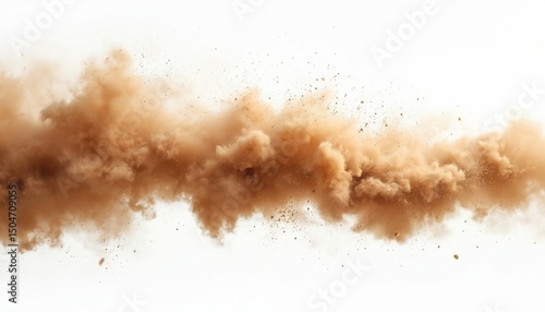 Dynamic illustration shows sandstorm swirling in dust cloud on white backdrop. Small sand particles fly through air. Hazardous weather event. Tornado concept. Environmental impact. Climate change.