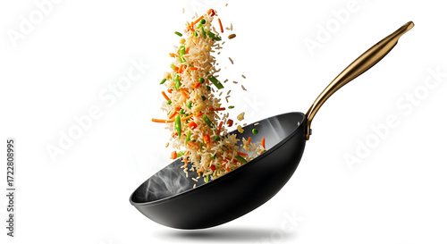 Dynamic image of fresh fried rice with vibrant mixed vegetables, tossed and rising from a hot black cooking pan against a clean white background, capturing motion and deliciousness.