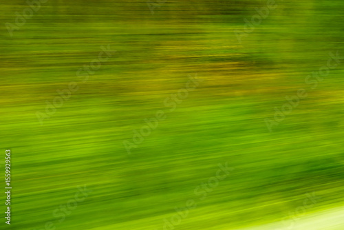 Dynamic motion blur view from high-speed train window: Green landscape, trees & fields rush past at high speed