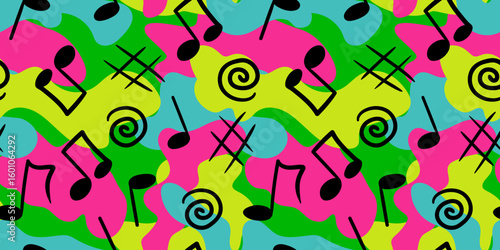 dynamic pop art background with musical symbols and wavy spots perfect for parties and events seamless pattern