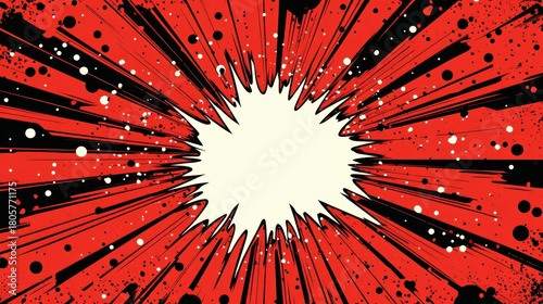 dynamic red comic explosion with jagged white center, black ink splatters and radiating speed lines conveying dramatic energetic impact