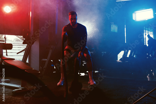 Dynamic Rope Workout in Atmospheric Gym Lighting