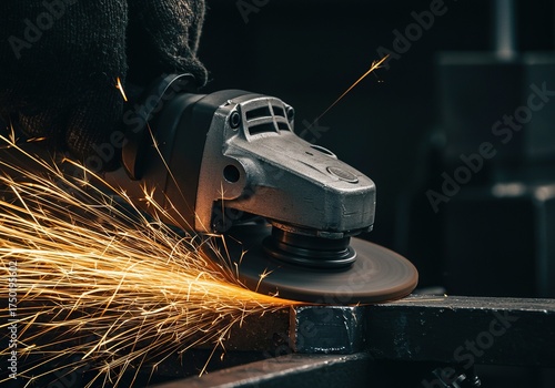 Dynamic scene of abrasive grinding disc vigorously removing excess material from a metal workpiece, generating a fiery spark cascade ,construction site ,construction ,engineering