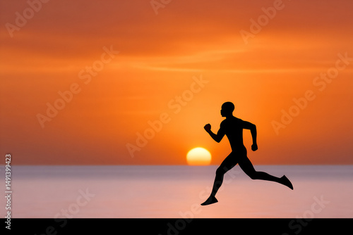 dynamic shot of a runner with a determined expression sprinting towards a finish line at sunset