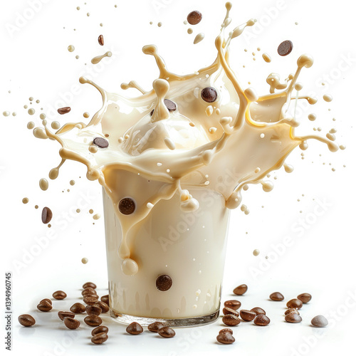 Dynamic splash effect of protein shake photography on a plain white background capturing motion and texture in -speed imagery