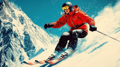 Dynamic Vintage Skiing Scene with Skier in Bright Red Jacket on Snow-Covered Mountains