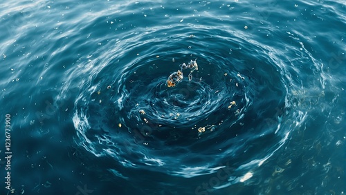 Dynamic water whirlpool captures floating debris in soft light