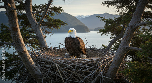 Eagle Nesting with Young overlooking Water and Distant Mountains