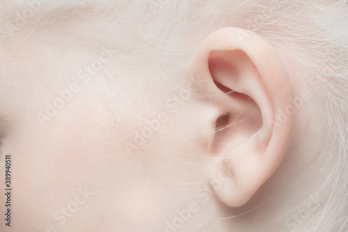 Ear. Close up portrait of beautiful albino female model. Parts of face and body. Beauty, fashion, skincare, cosmetics, wellness concept. Copyspace. Well-kept skin, fresh look, details.
