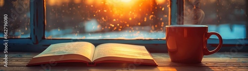 Early morning writing session, a cup of coffee beside, in the warm light of sunrise, reflecting and planning the day ahead