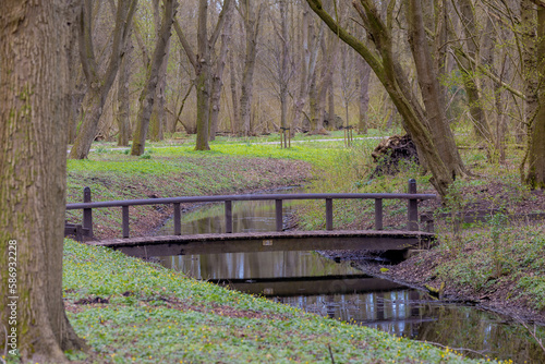Early spring Landscape with bare tree trunks and green grass, Selective focus of wooden bridge crossing canal, Amsterdamse Bos (Forest) Park in the municipalities of Amstelveen, Amsterdam, Netherlands