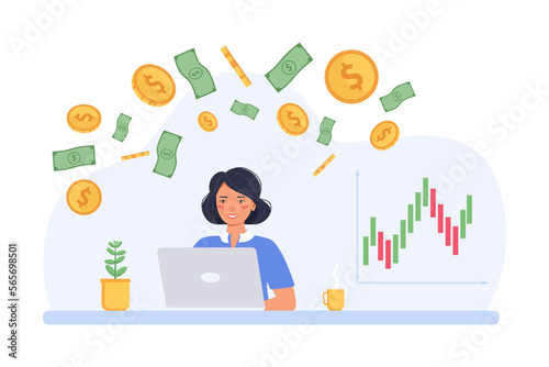 Earn money online, woman with a computer banknotes and coins. Success concept. Vector illustration in flat style