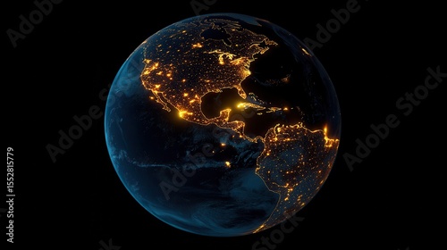 Earth at night shows city lights in North and South America. Use for projects about global networks and population.