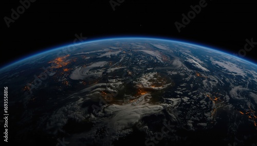 Earth from space showcasing illuminated cities and a clear atmosphere against a dark background