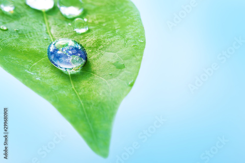 Earth in water drop reflection on green leaf with light background, earth day and environment concept, Elements of this image furnished by NASA
