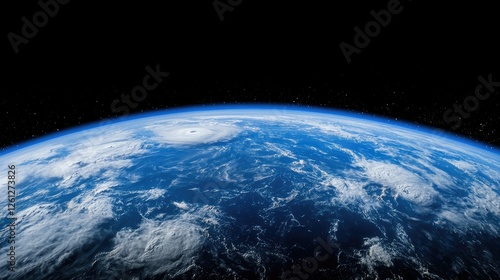 Earth seen from space, swirling clouds, cosmic background, scientific view, educational use