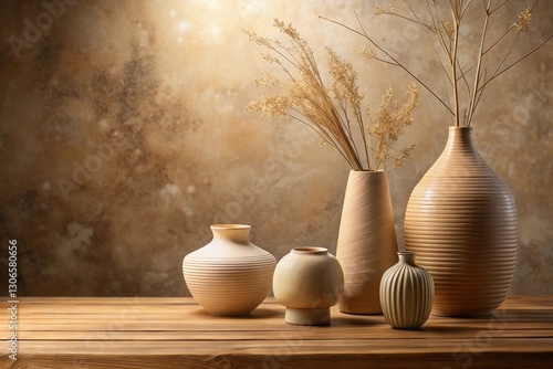Earthy Tones A Still Life Featuring Dried Floral Arrangements in Elegant Ceramic Vessels on Rustic Wooden Surface