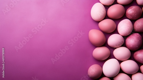 Easter background with pink eggs on purple background, top view, copy space