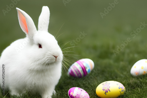 easter bunny with easter eggs on a grass field, closeup