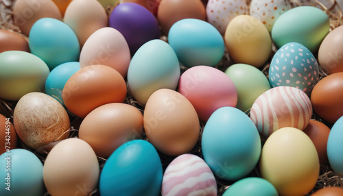 Easter colorful eggs pink, blue, green and white. Easter celebration concept.