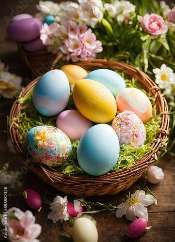 Easter. Easter eggs in a basket. Easter decoration. Easter abstract blurred background. Holiday, symbol, identity.