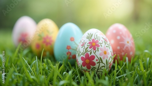 Easter Eggs with Delicate Floral Patterns on Fresh Green Grass