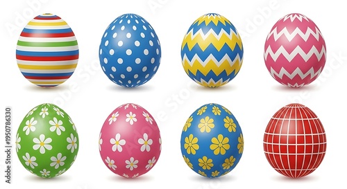 Easter Eggs with Various Colorful Patterns and Designs on White Background