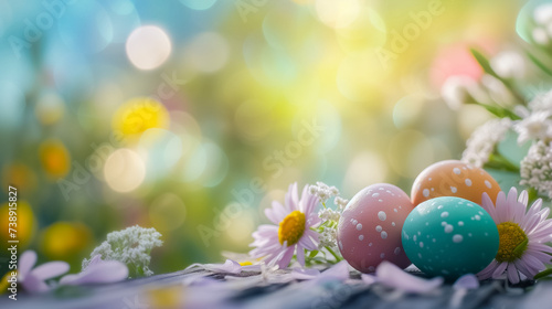 Easter greeting card with painted Easter eggs on wood with flowers on blurred background. free space