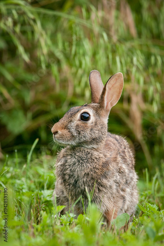 Eastern cottontail (Sylvilagus floridanus) rabbit sitting among vegetation on a spring day at Richard W. DeKorte Park in the New Jersey Meadowlands