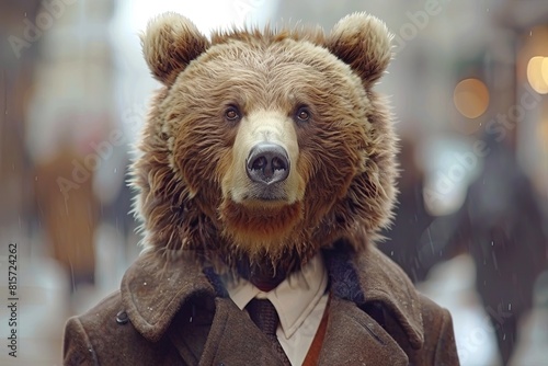 Eccentric bear character in stylish attire under falling snow